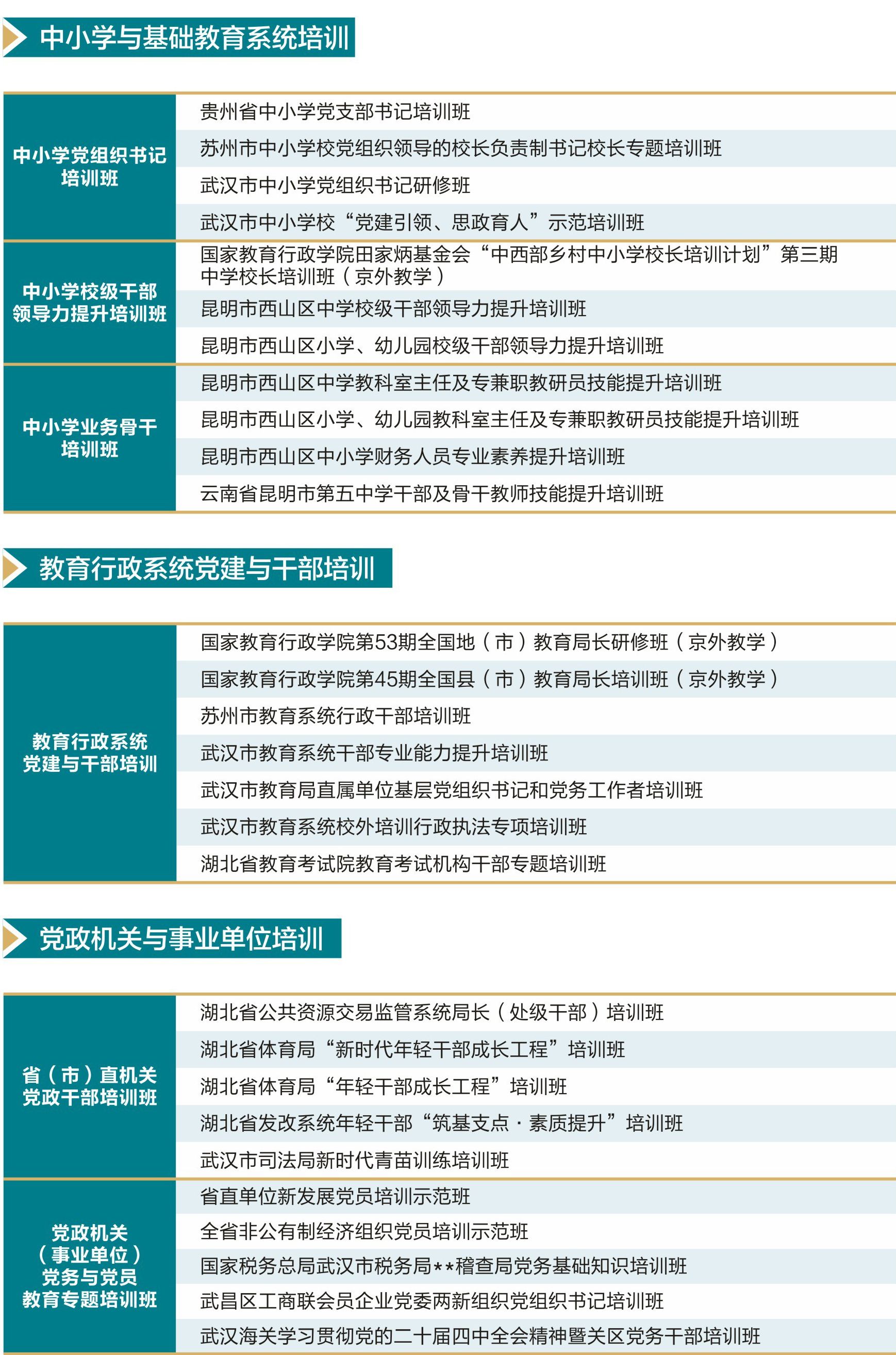 为深入学习贯彻党的二十大、党的二十届历次全会精神及全国教育大会精神,认真履行干部党员教育培训高校基地职责,经研究决定,华中师范大学培训中心(职业与继续教育学院)干部党员培训部在认真完成好中组部、教育部及湖北省委组织部、省教育厅下达的培训任务基础上,面向各级党政机关、企事业单位和社会团体承办各类培训项目,现将相关事宜公告如下: