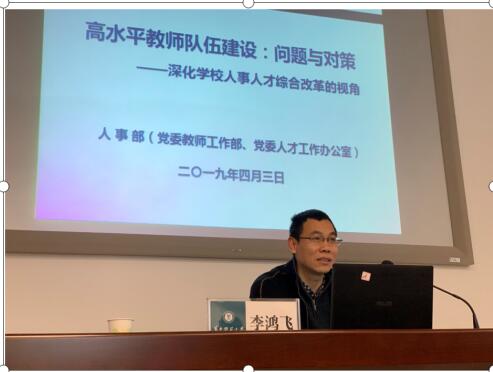 4月3日上午,华中师范大学人事部(党委教师工作部、党委人才工作办公室)李鸿飞教授为75期中南班学员作主题为《高水平教师队伍建设问题与对策》的专题讲座。讲座由教育部中南教育管理干部培训中心班主任陈晨主持。