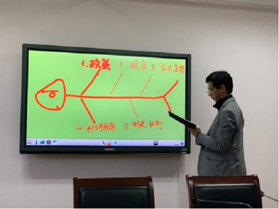 科研组凝炼出科研管理人员和一线科技工作者最关心的问题,并针对此问题进行鱼骨图原理分析。由于高校科研工作具有涉及面广、工作程序复杂、情况变化快、周期长、考核困难、个性化案例多等特点,针对高校科研工作全过程中存在的诸多问题,经过各位学员的认真梳理、分析总结,构建了科研工作鱼骨分析图,设计了以科研经费管理和使用困难为鱼头,政策、观念、诚信、监管体系、科研服务等各种导致科研经费使用和管理困难的主要原因为骨的分析图,得到了科研组学员的一致认同,达到了结构化研讨的目标,并推荐陆军为本组发言人下周在大班进行全体交流。