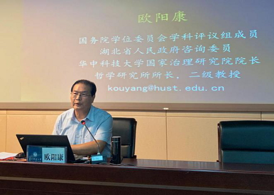 9月27日上午,华中科技大学国家治理研究院院长、哲学研究所所长欧阳康教授作了题为《新时代中华文化建设与民族伟大复兴》的报告会。教育部第76期中南班和第79期湖北省直机关干部进修班的全体学员聆听了报告。