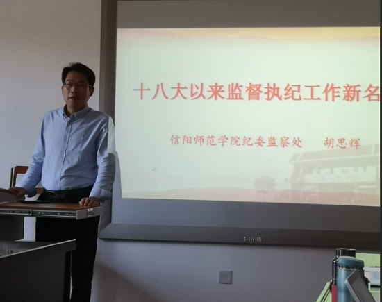 信阳师范学院纪委监察处办公室副主任胡思辉老师为学员们详细介绍了党的十八大以来监督执纪工作出现的十种新名词。