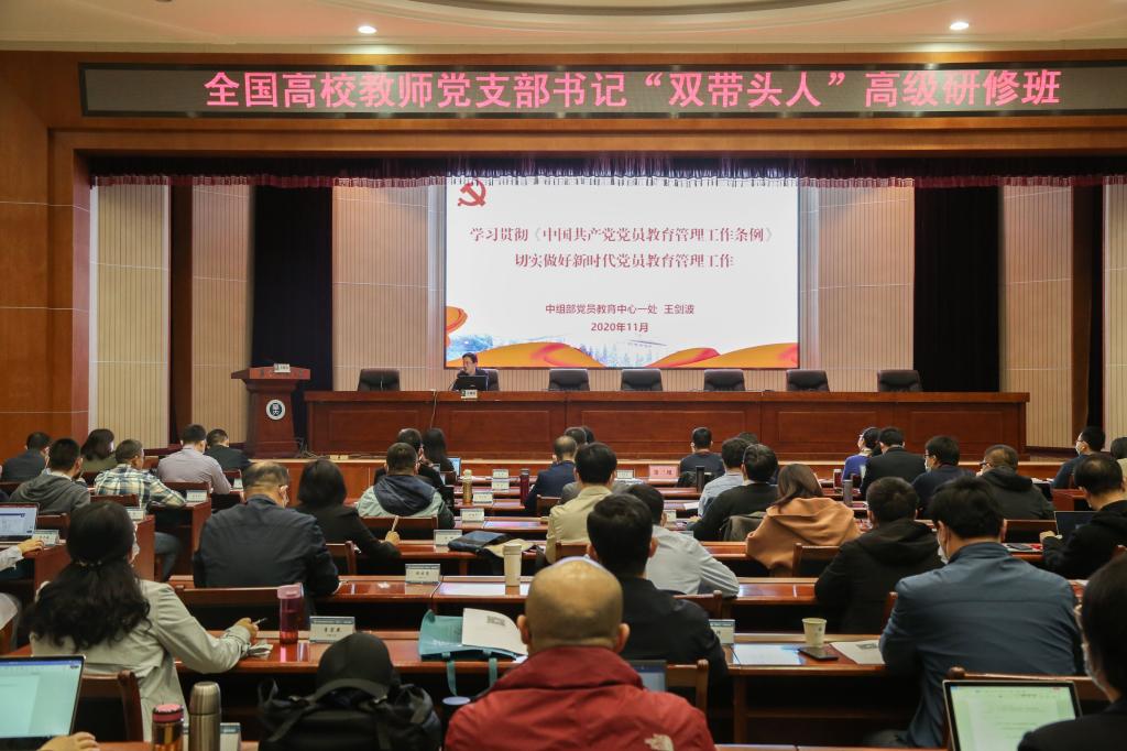 11月1日下午,中央组织部党员教育中心一处处长王剑波为全国高校教师党支部书记“双带头人”高级研修班100位学员作了题为《学习贯彻<中国共产党党员教育管理工作条例>,切实做好新时代党员教育管理工作》的主题报告。