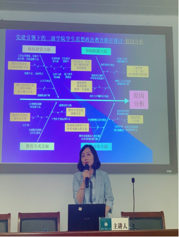 “学工一组”由高华珊老师进行分享。该组围绕“新时期高校思想政治教育路径探讨”的主题,从体制机制、队伍建设、教育方式、教育内容四个维度展开研讨,分析总结以上四个维度存在的问题及原因,主要在于“三全”育人体制机制构建不完善;辅导员职业化、专业化程度不高,班主任(导师)队伍投入精力不足;教育方式方法吸引力和创新性不足;思政教育内容与专业教育融合度不高。他们提出以下对策:加强“三全”育人体制机制建设,协调党政群团形成合力;打通辅导员职业化、专业化发展路径,加强学生骨干队伍的管理培养;充分运用新媒体、大数据创新工作方式方法;推进实施“五育”并举,着力打造一批课程思政精品课。