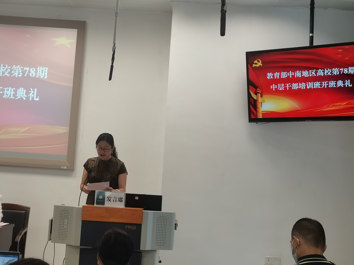 来自广东技术师范大学的苏敏作为学员代表进行发言。她感谢培训中心的用心策划、精心谋划和高质量服务,建议同期学员珍惜友情,培养热情,保持激情,并代表78期中南班学员郑重承诺:明确学习目标,确保学习有“态度”;严守纪律规范,确保学习有“尺度”;坚持学用结合,确保学习有“深度”。