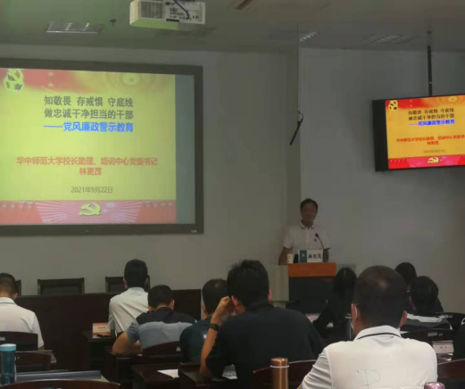 9月22日下午,华中师范大学校长助理、培训中心党委书记林更茂研究员应邀在管理教育综合大楼202报告厅为中南班78期全体学员作了《知敬畏存戒惧 守底线 做忠诚干净担当的干部》党风廉政警示教育专题报告,他就党风廉政建设与反腐败斗争热点问题进行了深入解读。报告由教育部中南教育管理干部培训中心78期班主任黄宝华和学员刘国平主持。