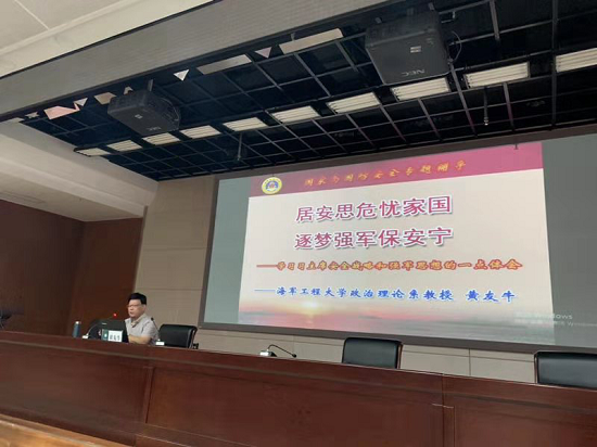9月26日上午,海军工程大学黄友牛教授为教育部中南地区高校第76期中层干部培训班作了《习近平新时代中国特色社会主义强军思想》的专题报告。新时代呼唤党的军事指导理论创新,习近平强军思想凝结着时代精神的精华。黄教授“以居安思危忧家园 逐梦强军保安宁”为题给我们上了生动精彩的一课,通过深厚的理论基础、详实的视频资料、丰富的报告内容、宏大的国际视角,鲜活生动的事例,从当前美国政策的新变化、我国周边面临复杂的新形势、强国必须强军、必须建设世界一流军队等方面,对习近平习近平新时代中国特色社会主义强军思想进行系统阐述、深入解读,使我们明白新形势下为什么要强军、强军目标是什么、怎样走中国特色强军之路等重大问题,使我们明白了富国必须强军,强国必须强军,强军才能安邦,强军梦就是强国梦。