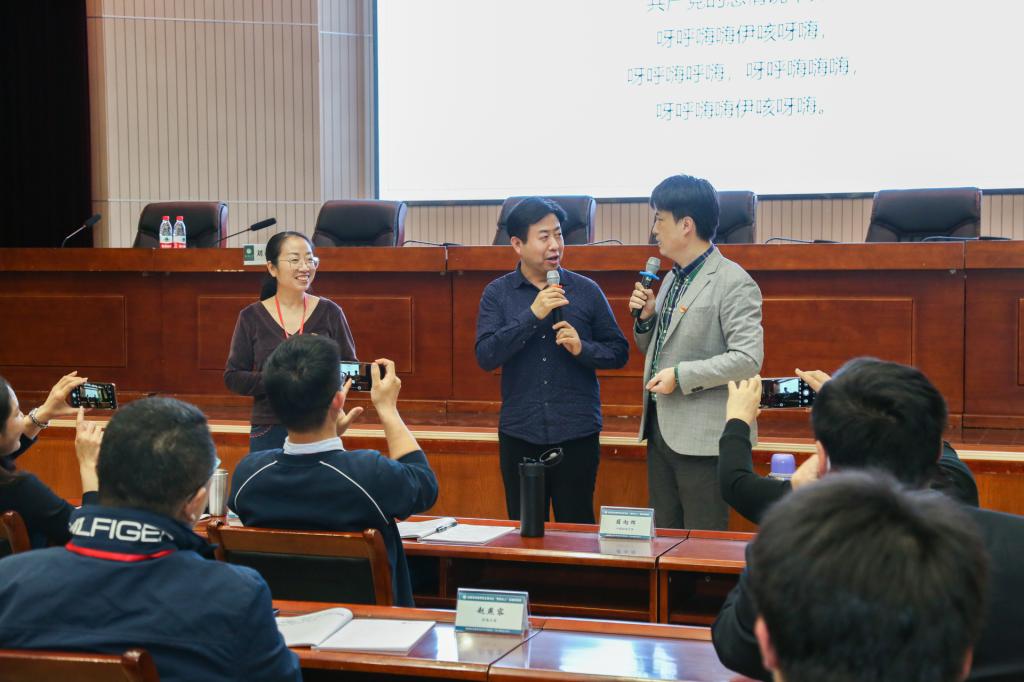 这堂红色主题音乐党课同时还给了我们很多惊喜,并为本次主题音乐党课带来了不小的高潮。在互动环节,来自中国地质大学(北京)地球物理与信息技术学院教工第一支部党支部书记李信富同志和北京语言大学马克思主义学院教工党支部书记杨林坡同志精彩的《长征》词朗诵;中央音乐学院音乐学系党支部书记刘小龙同志与北京中医药大学中医学院循证医学中心党支部书记曹卉娟同志男女生对唱,同时带领大家合唱《解放区的天》,仿佛将大家带入那个时代。