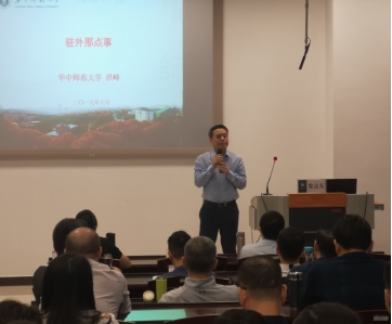 4班学员代表洪峰(华中师范大学国际交流与合作处副处长)以《驻外那点事》为题,结合自己的驻外工作经历,与大家分享了外交工作常识、教育外交人员的日常工作以及他对中国特色大国外交的体会。