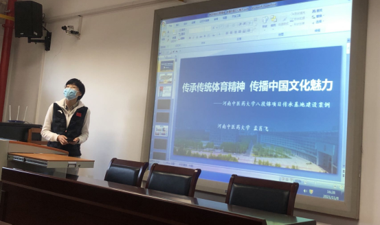 河南中医药大学体育学院孟肖飞学员以《传承民族体育精神传播传统文化魅力》为题,从申报背景、建设路径、取得成效、前景展望等方面介绍了学校申报建设国家级中华优秀传统文化传承基地(八段锦项目)的情况,以及围绕基地建设,辐射带动周边中小学、社区、医院、企事业单位共同练习和传承八段锦的积极效果,推动中华优秀传统文化走入寻常老百姓的生活,丰富群众体育运动,增进国民身心健康,增强民族文化自信等方面作出的有益探索和积极贡献。