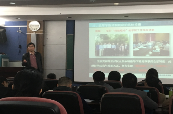 首先,物理科学与技术学院党委陈迪明书记在物理学院4楼报告厅为学员作“创新内部管理,促进内涵发展”的主题报告。陈书记从物理科学与技术学院的基本情况、华中师范大学创建改革特区的背景、改革学院体制机制的具体举措、加强特区建设的初步成效以及“十三五”期间学院的发展规划等五个方面为全体学员介绍了物理科学与技术学院作为华中师范大学“特区”建设的具体做法、取得成效等。接着,陈书记带领全体学员观看了物理科学与技术学院荣获全国先进基层党组织的宣传视频。随后,学员们现场观摩学习了物理科学与技术学院党建工作、文化建设等工作亮点。