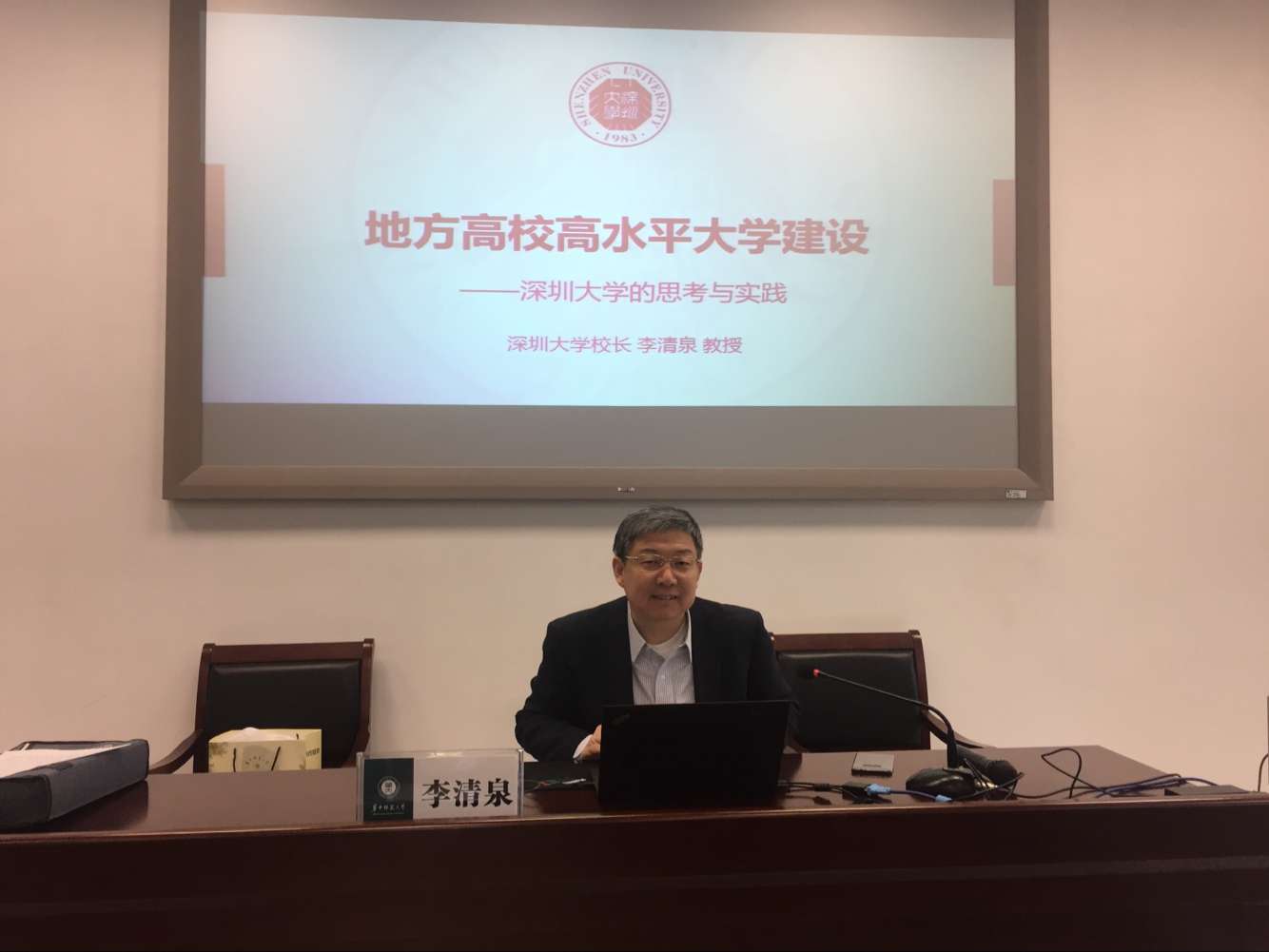 4月9日上午,深圳大学校长李清泉教授为教育部中南地区高校第73期中层干部培训班学员作了《地方高校高水平大学建设》的专题报告。华中师范大学公共管理学院院长、教育部中南教育管理干部培训中心常务副主任卢新海教授主持报告会,第73期中南班全体学员参加报告会。