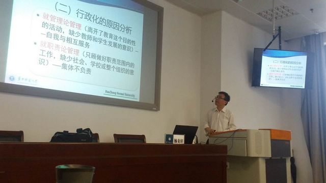 4月12日上午,华中师范大学公共管理学院博士生导师,湖北省学校德育研究中心暨华中师范大学道德教育研究所研究员杨炎轩教授应邀为教育部中南地区高校第73期中层干部培训班学员作了题为《认识工作,超越工作:高校管理者的专业化角色》的专题交流报告。