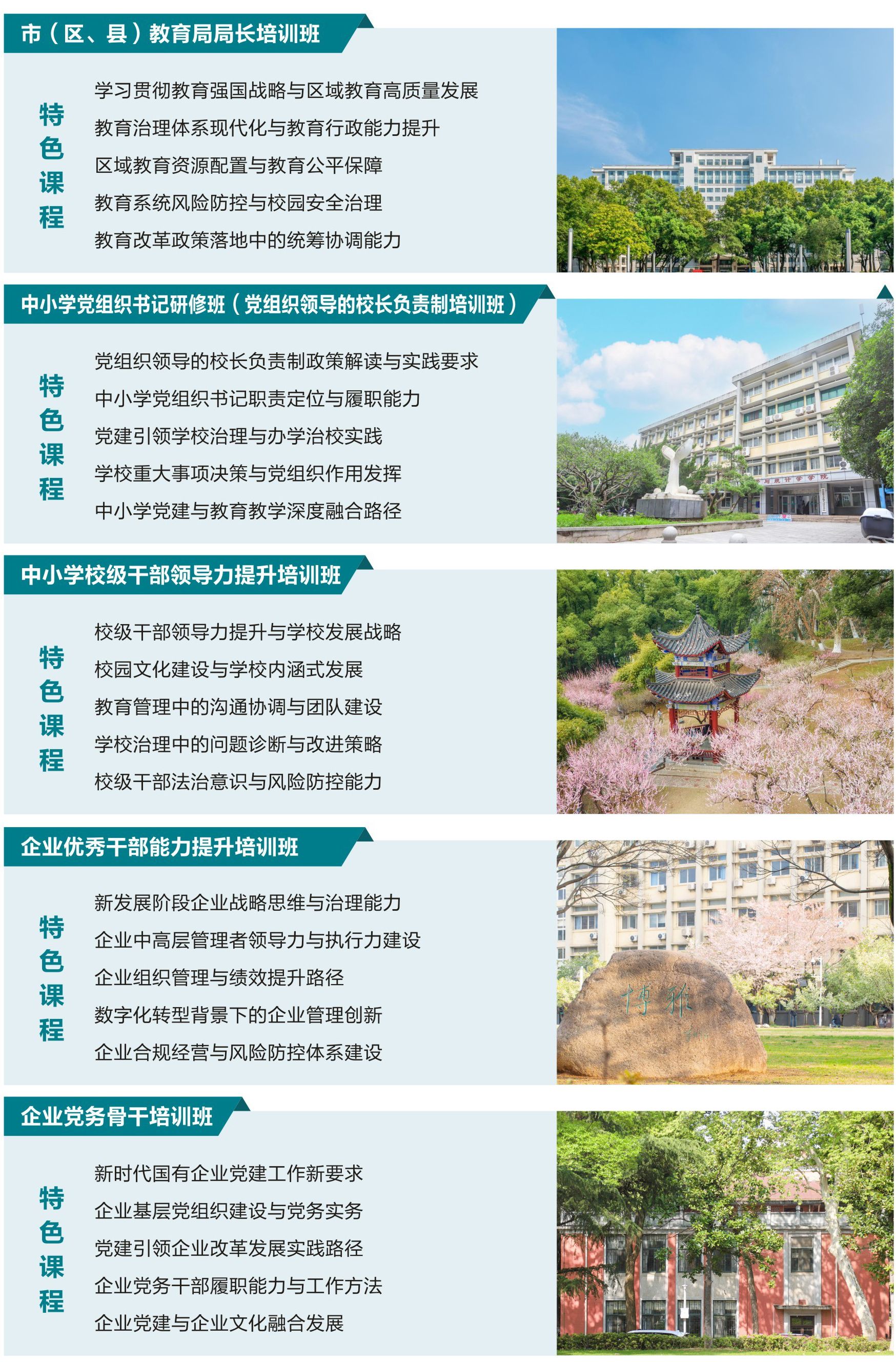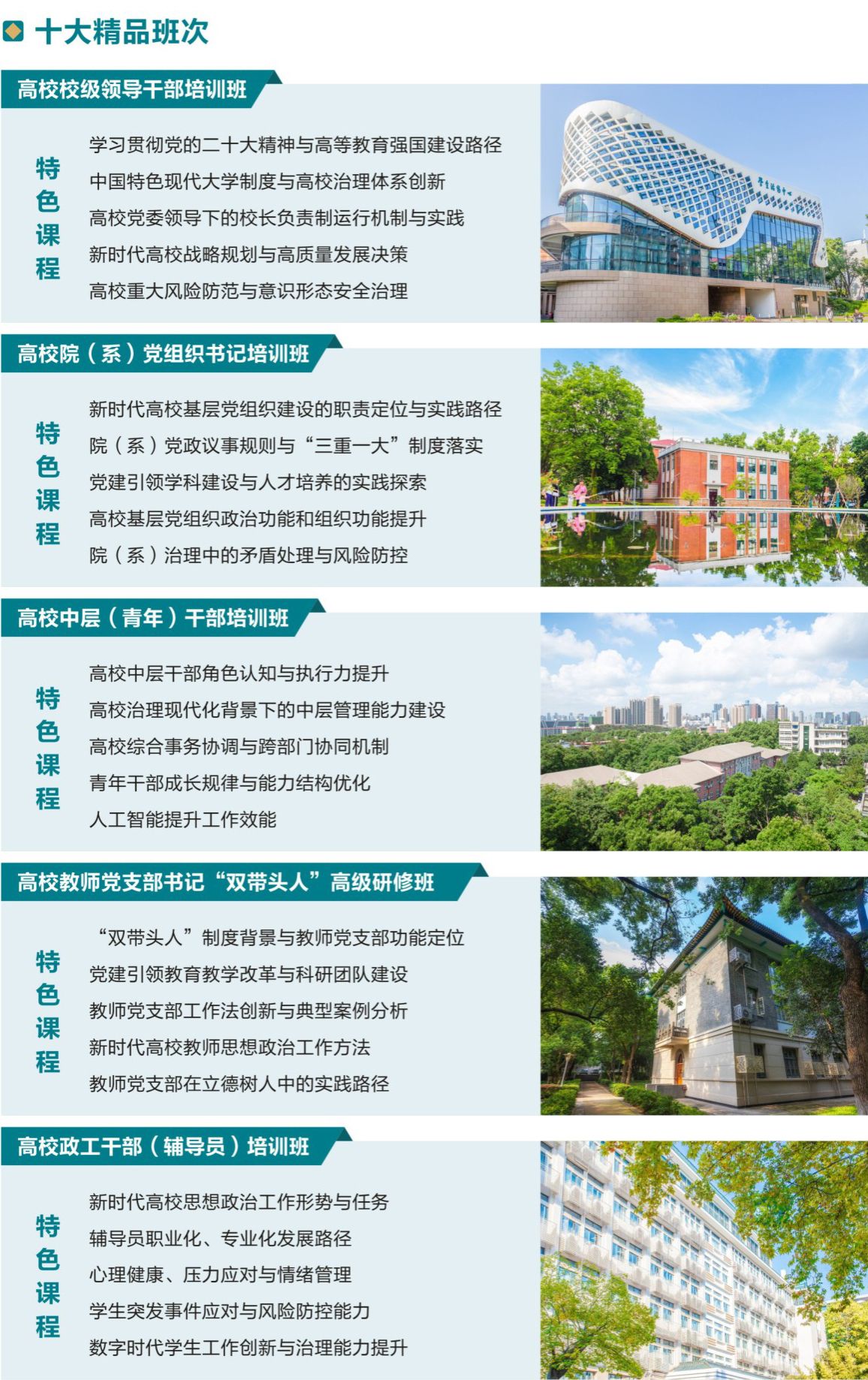 情况介绍:该班次旨在深入研讨高等教育改革和发展中的有关理论与实践问题,教学计划涵盖理论教育与党性教育、新时代高等教育改革与实践探索、综合素养与能力提升三个模块。