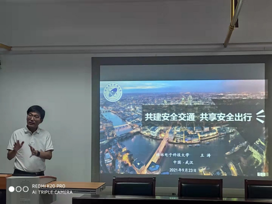 王涛(桂林电子科技大学建筑与交通工程学院副院长以“共建安全交通 共享安全出行”为题,从我国交通运输业历史成就、交通安全现状、机动车驾驶员及行人与非机动车安全等方面,结合案例为学员们进行了交通安全教育。