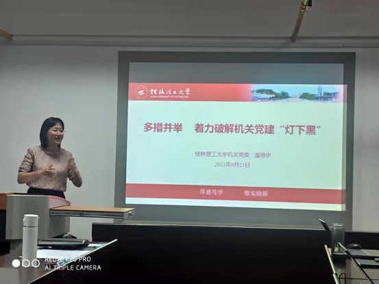 潘思伊(桂林理工大学组织部机关党委专职副书记)以桂林理工大学为例,作了题为“多措并举 着力破解机关党建‘灯下黑’”的报告。她分析了机关党建存在的问题,从“对标新时代新定位新职责,优化落实统一领导机制”“对标全面从严治党主体责任,发挥机关支部战斗堡垒作用”“聚焦践行初心使命,引导机关党员争当先锋模范”三个方面提出了破解举措。