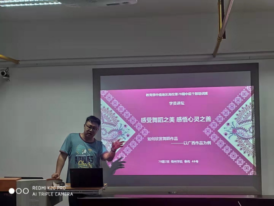 秦伟(梧州学院校团委副书记)以“感受舞蹈之美、感悟心灵之善:如何欣赏舞蹈作品——以广西作品为例”,介绍了广西文化特色及舞蹈种类,指出可以从艺术之美、文化之真、信仰之善的角度欣赏舞蹈作品,并现场分享播放了广西经典舞蹈视频。