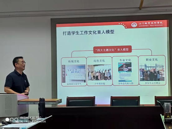 杨海涛(江门职业技术学院教育与教育技术系党总支书记)以“学生工作特色体系构建:“文化”+育人体系构建与实践”为题,介绍了江门职业技术学院教育与教育技术系“文化”+育人的特色,分享了传统文化、红色文化、专业文化、职业文化“四大主题文化”的育人模型。